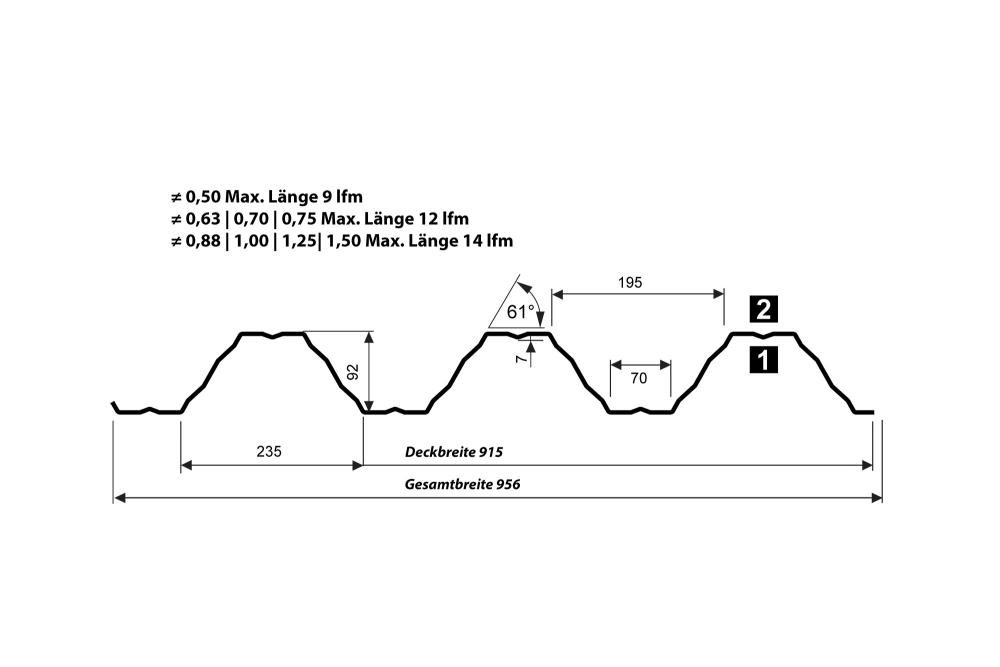 ≠ 0,63 | 0,70 | 0,75 Max. Länge 12 lfm