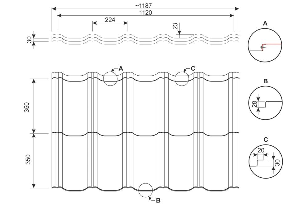 LOARA Dachpfannenpaneel entstand durch Verfeinerung der Form des TUR-Dachpfannenpaneels. Die höhere Profilierung ist eine interessante Fortsetzung der bei den Kunden beliebten Serie. Der Dachpfannenpaneel ist symmetrisch, was die Montage wesentlich erleichtert.