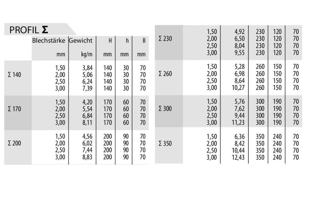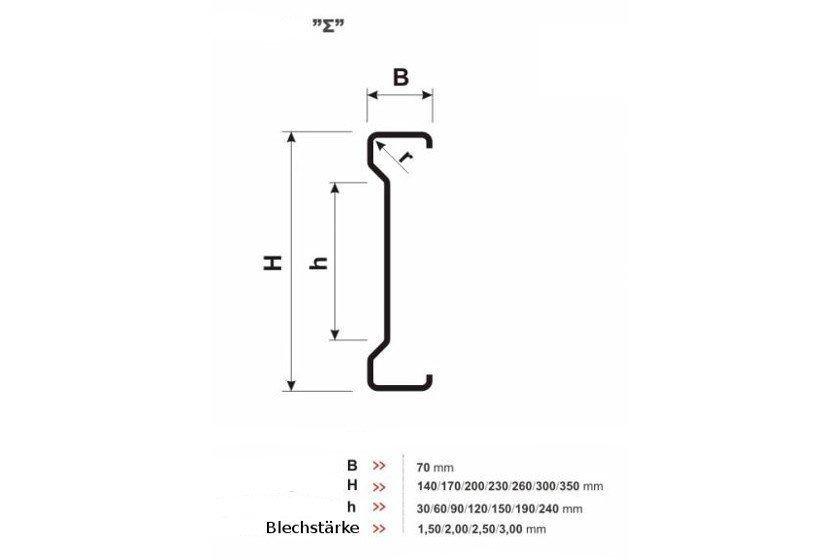 Stahlband (S280 GD bzw. S350 GD) verzinkt mit einer Stärke 1,50 bis 3,00 mm. Je nach Einsatzbereich und Bedarf erfordern die Profile keinen zusätzlichen Schutz, wobei sie pulverbeschichtet werden können.
