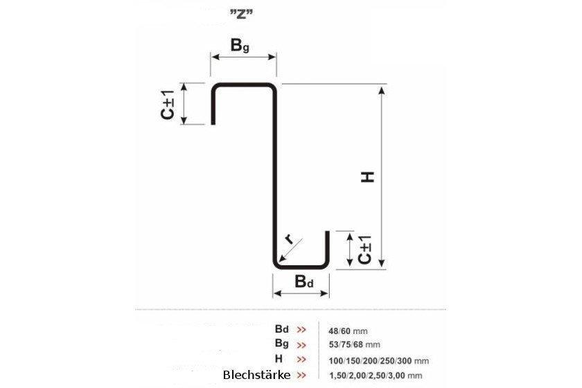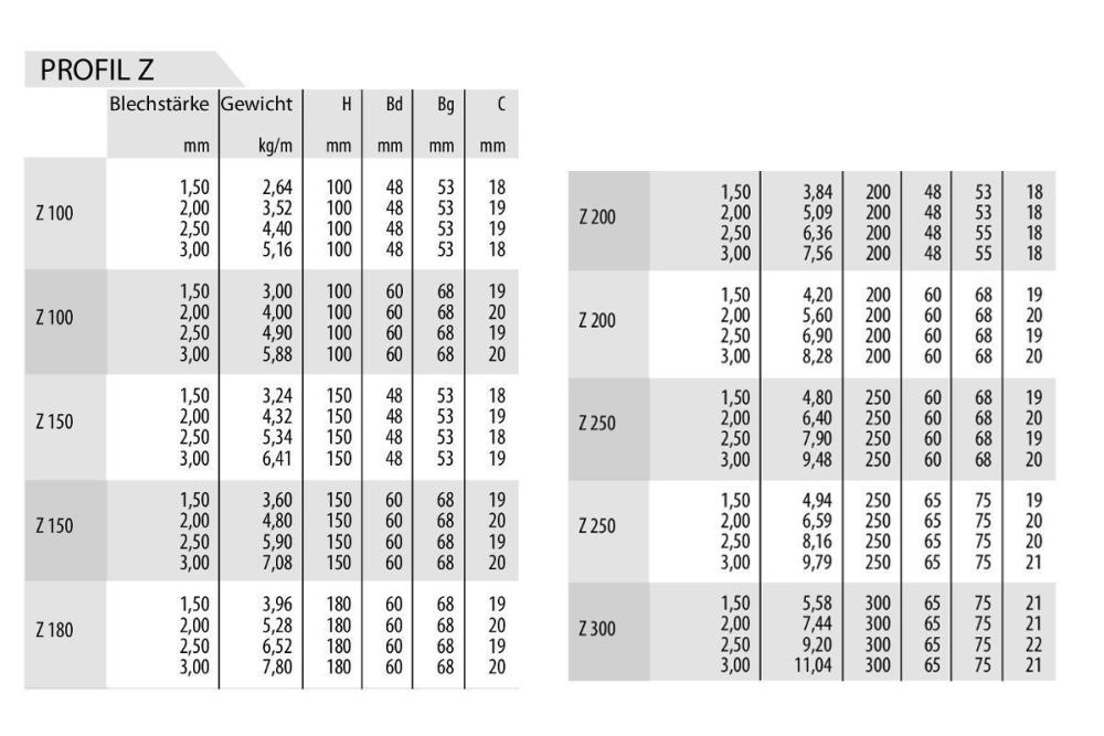 Stahlband (S280 GD bzw. S350 GD) verzinkt mit einer Stärke 1,50 bis 3,00 mm. Je nach Einsatzbereich und Bedarf erfordern die Profile keinen zusätzlichen Schutz, wobei sie pulverbeschichtet werden können.