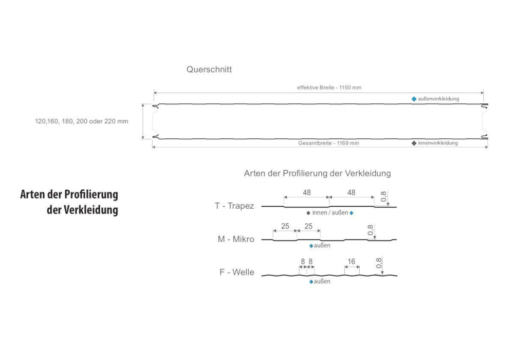 Aluzink, HPS200, Matt-Grobkörnig 35μm, PURLAK 50μm, PURMAT 50μm, PVDF, Standardpolyester 25μm